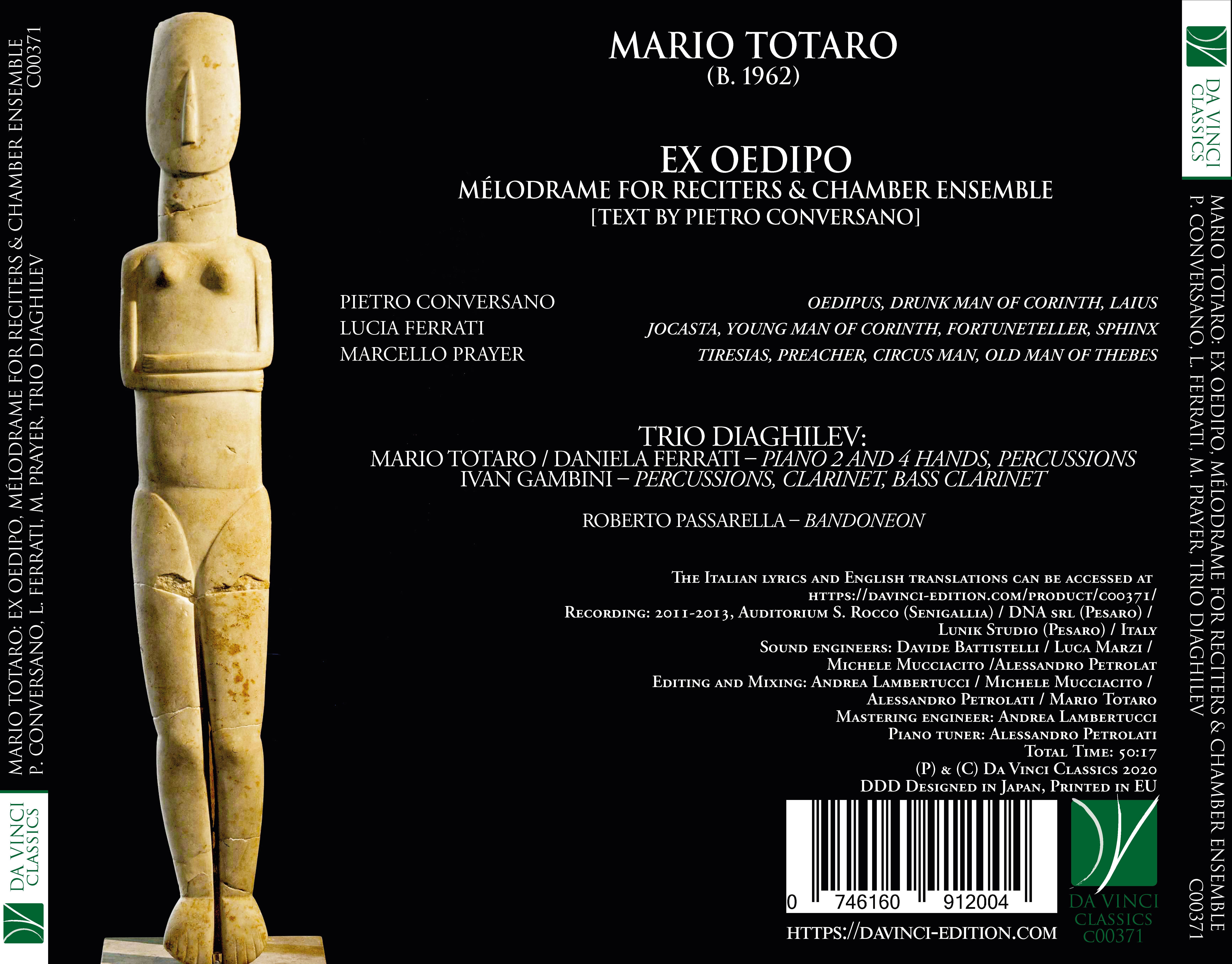 The original idea was to create a new way to narrate the myth of Oedipus. Ex Oedipo is a drama in con-cert where Mario Totaro’s original music and the words of Pietro Conversano integrate to generate a com-plex, fluid yet rigorous performance. The musical instruments create a rapid sequence of a few elements, continuously changing that blend with the three solo voices.