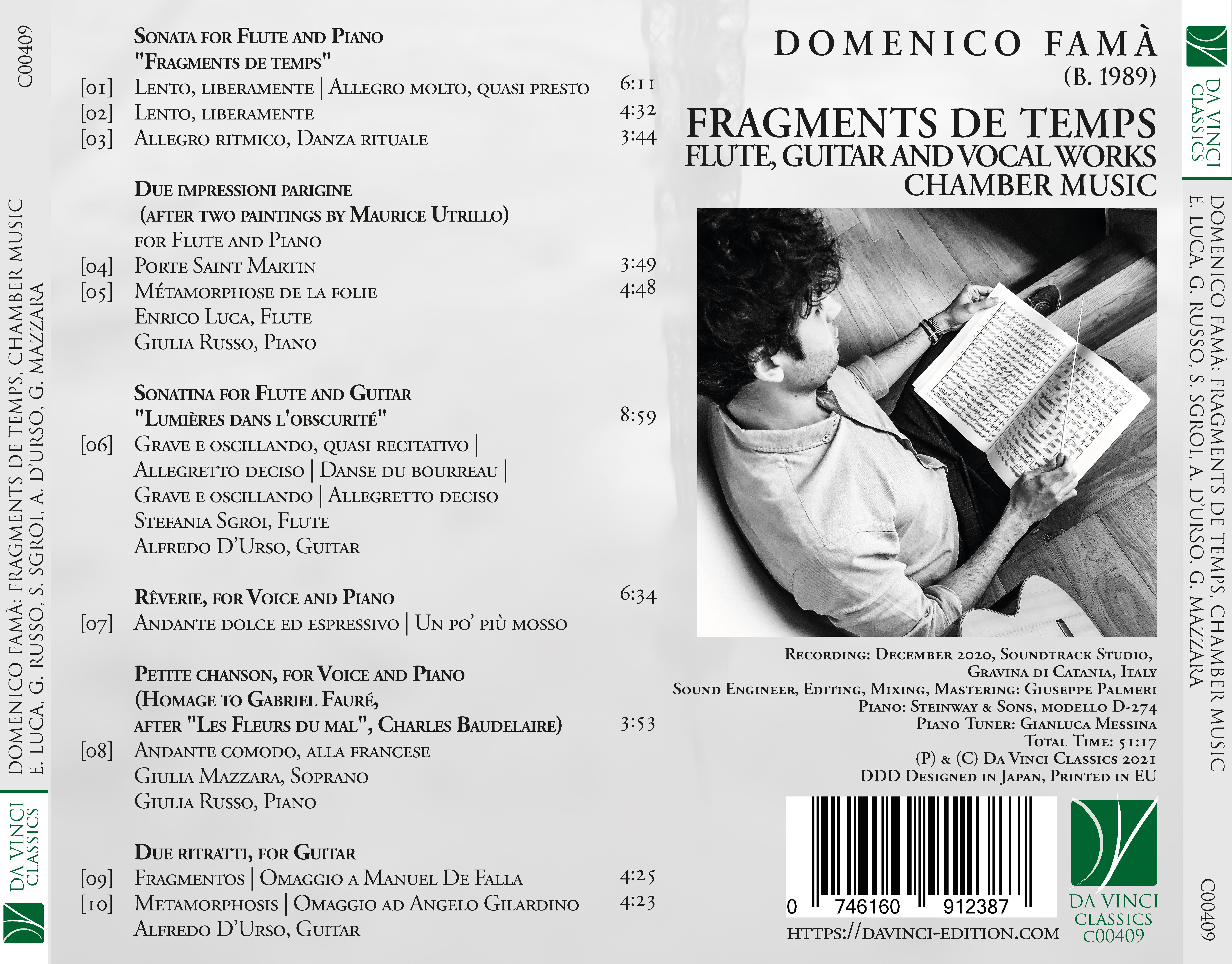 To speak about the music by Domenico Famà, a young but already well-known Sicilian musician, means to speak about a world of references which brings us closer to the great art of the early twentieth century. This composer’s sources of inspiration are manifold. Before becoming a composer, indeed, he began a felicitous path as an instrumentalist and performer (he is in fact an excellent guitarist and orchestra conductor). The matter of which sounds are made is therefore not alien to him. He is familiar with the actual “doing” of those who shape the sounds, beyond thinking them and turning them into language. His is therefore a multifaceted personality, and he thinks about music as constituting the crossroads of suggestions, a melting pot of horizons allowing different Times to meet beyond Time. His main source of inspiration is twentieth-century French music; almost all of the works recorded here are indebted to that cultural world. It is important, in this preliminary stage, to clarify that it is not a process of imitation. Being a true Sicilian, Famà preserves the deep ideals of Greek culture and philosophy in his consciousness as a man rooted in Magna Graecia. Art is channelled through the practice of poetry; as Plato and Aristotle teach us, it is mimesis, but it is also accompanied by mathesis, i.e. learning and knowledge. It is not, therefore, a model to re-propose, but rather an aesthetic affinity which becomes a personal possession, an ideal and stylistic signature to which one should refer. The music by Fauré, Debussy, Falla is the track, the suspended rope on which Domenico walks in balance. This path is indeed all but easy, because it is always threatened by the risk of clichés and déjà-vu. Only by totally adhering to this poetic dimension, one finds – as in fact happens – expressive originality and authenticity.