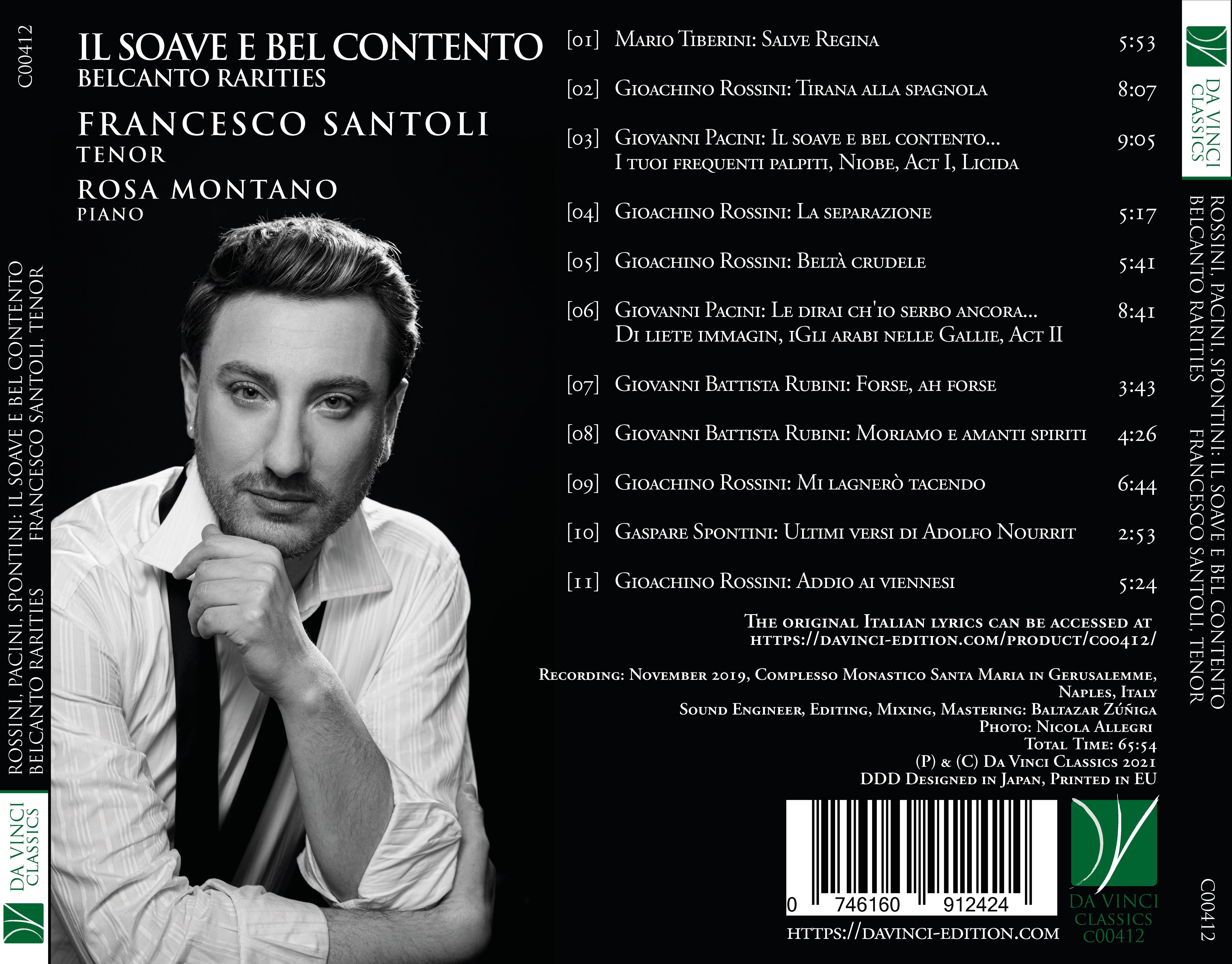 This is the context evoked by Il soave e bel contento, a collection of compositions in the name of refinement and a homage to a specific vocal aesthetics. The work behind it is in fact the fruit of a synthesis. By joining the careful study of the score to the impassionate rediscovery of contemporaneous sources, this work aims at reviving a performance approach, one that should be as close as possible to period performance practice and should reveal the multifaceted expressive possibilities of the tenor voice. On the other hand, the very choice of the repertoire suggests the adoption of a timbre suited for highlighting the figure of the “sfogato” tenor. This is a specific voice type, particularly in vogue between the Twenties and Thirties of the nineteenth century. Especially in the operas by Rossini and Bellini, the role of the loving youth/nobleman was assigned to this voice type.