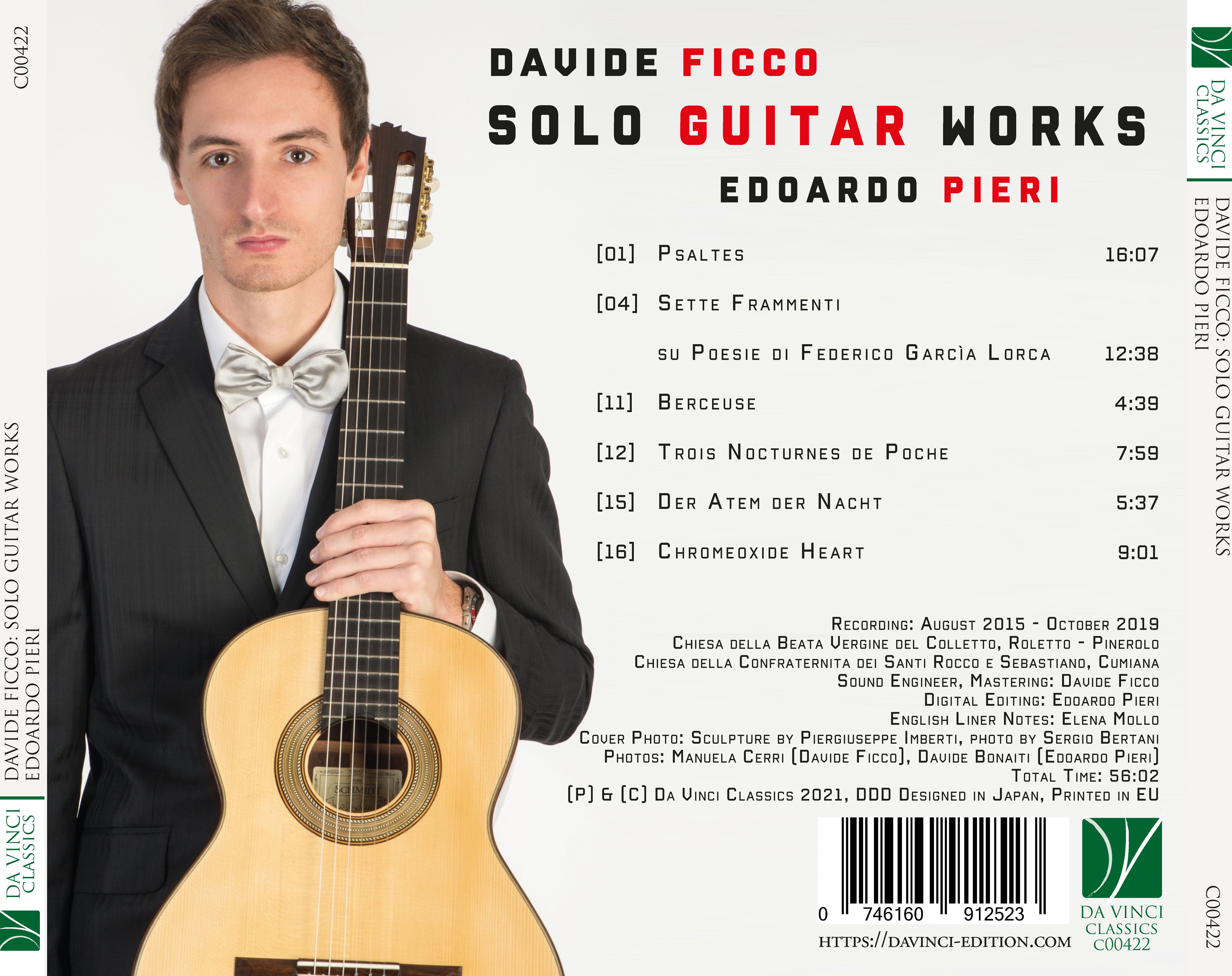The figure of Davide Ficco occupies a special place among the numerous guitarists/composers who enlarged the repertoire for their instrument. In fact, his figure is not exclusively limited to the universe of the six strings; rather, he gathers its idioms and intertwines them in a thick network of artistic, cultural, historical and ethnic references, making use also of the possibilities for research and expansion provided by new technologies. His output for the guitar’s six strings is in fact a successful example of cultural eclecticism. His vast knowledge does not only encompass the guitar repertoire, or the classical repertoire in general, but rather embraces various artistic forms, lingering also over the history of extra-European cultures and traditions. This all is poured into his music, in the form of countless extra-musical references, which may be more or less hidden, and which bestow refinement and elegance on his music without being burdened by an ostentatious intellectualism. Such richness does not belong to Ficco’s compositional activity only, but also derives from his work as a performer. Ficco has practised this activity for years, combining the musician’s technical know-how with the ability to draw diverse influences together and to let them emerge. However, this all happens in the service of the musical score, and not of an intellectual hedonism.