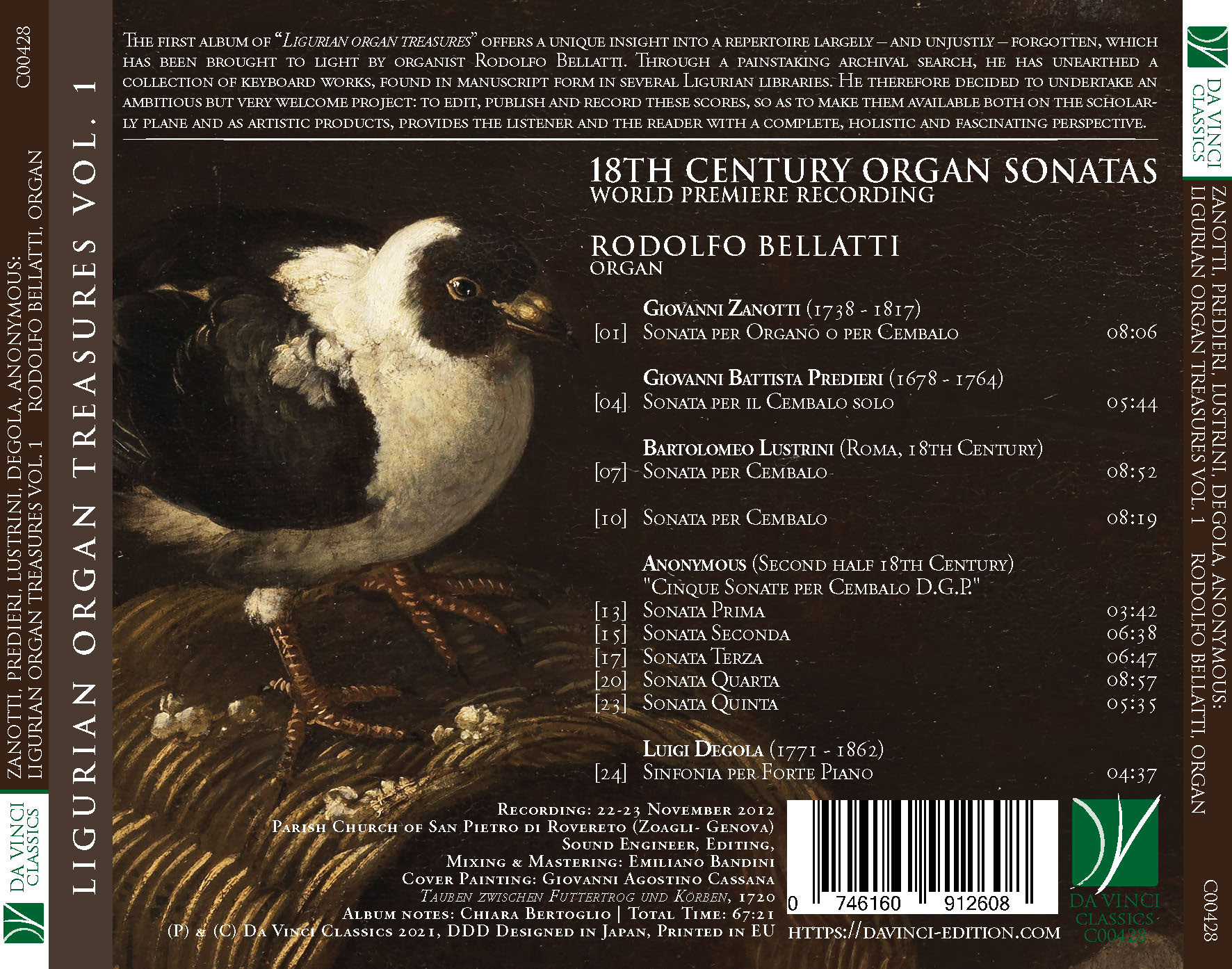 This Da Vinci Classics album offers a unique insight into a repertoire largely – and unjustly – forgotten, which has been brought to light by the recording artist. Through a painstaking archival search, he has in fact unearthed a collection of keyboard works, found in manuscript form in the Library of the Conservatory “N. Paganini” of Genoa. He therefore decided to undertake an ambitious but very welcome project: to edit, publish and record these scores, so as to make them available both on the scholarly plane and as artistic products. It is no easy task, of course; but the possibility of studying a score – or rather a comprehensive collection of scores – from the double viewpoint of musicianship and musicology provides the listener and the reader with a complete, holistic and fascinating perspective.