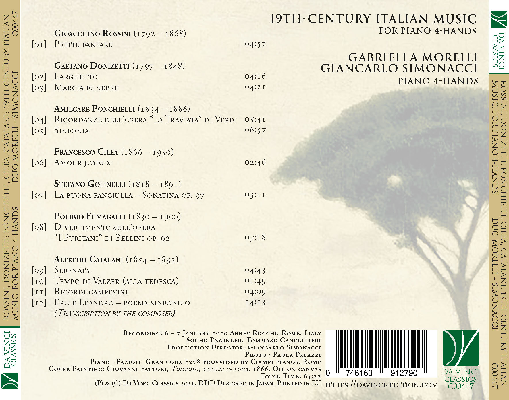 Stefano Golinelli and Polibio Fumagalli are the only two non-operatic composers whose works are included in this album. The Bolognese Stefano Golinelli was an appreciated concert pianist, and wrote about 300 piano works, among which only two pieces for four-hand piano duet are found: they are his Divertimento sulla “Lucia di Lammermoor” op. 3 and La buona fanciulla – Sonatina op. 97, full of tenderness and of joyful liveliness.
