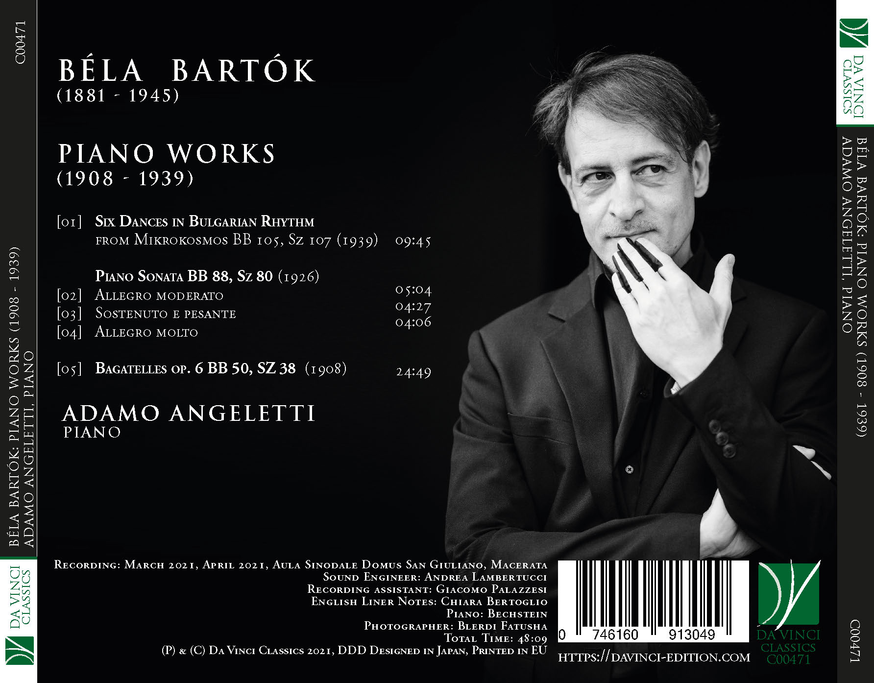 He had begun his musical activity as a concert pianist and pedagogue at the Academy of Budapest: there, the pupils had nicknamed him “The Wooden Prince” (with a pun on his famous composition), by virtue of his aristocratic manners and of his stiffy figure. But if his early piano output is clearly influenced by the Romantic virtuoso tradition (in particular by Liszt), his works soon began to take inspiration from the folk heritage, which he relentlessly studied with his colleague and friend Zoltán Kodály. The works recorded in this Da Vinci Classics album bear witness to this artistic quest, as well as to Bartók’s unceasing interest both in piano virtuosity and in pedagogy.