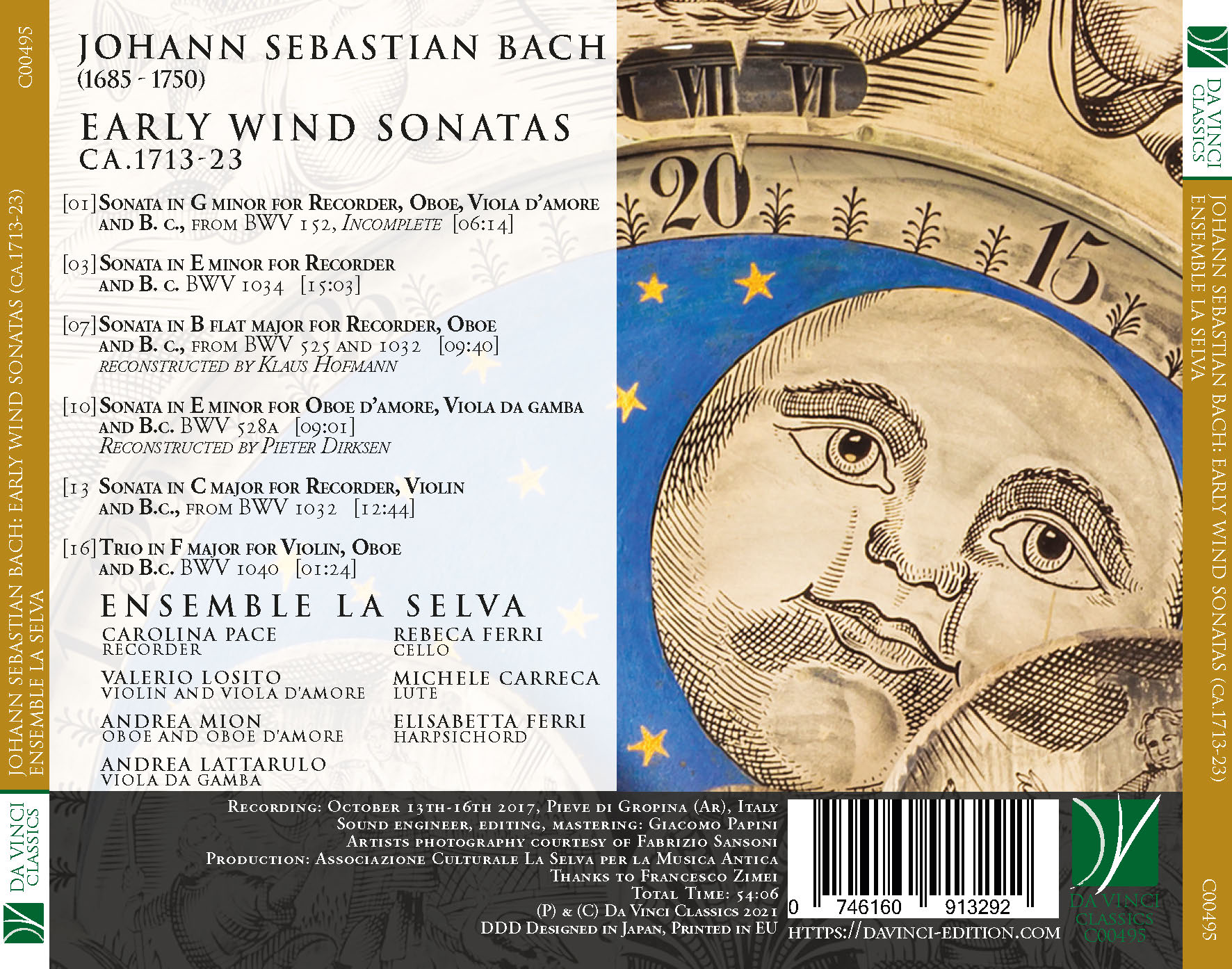 This disc contains some sonatas for wind instruments by Johann Sebastian Bach from his years in Weimar (1708-17) and Cöthen (1717-23), having in common – as they have come down to us or as several musicologists have proposed – their being intended for the recorder and/or the oboe. The interchangeability of instrumentation, linked to different creative periods, to practical contingencies, and to the inexhaustible desire for perfection that induced the genius of Eisenach, according to the testimony of his earliest biographer Johann Nikolaus Forkel, to continually revise his own works, often makes it difficult to go beyond their sterile catalogue dates in tracing their evolution. For this reason an experimental approach was chosen here, to bring back to their presumably original state what today is a handful of works, which were part of a much larger repertory. Chamber music was becoming the composer’s principal occupation in the time period under consideration, which was decisive in the progress of Bach’s career from organist to Konzertmeister (1714) and then to Kapellmeister of a Calvinist court (1717) essentially devoted to the cultivation of secular music.
