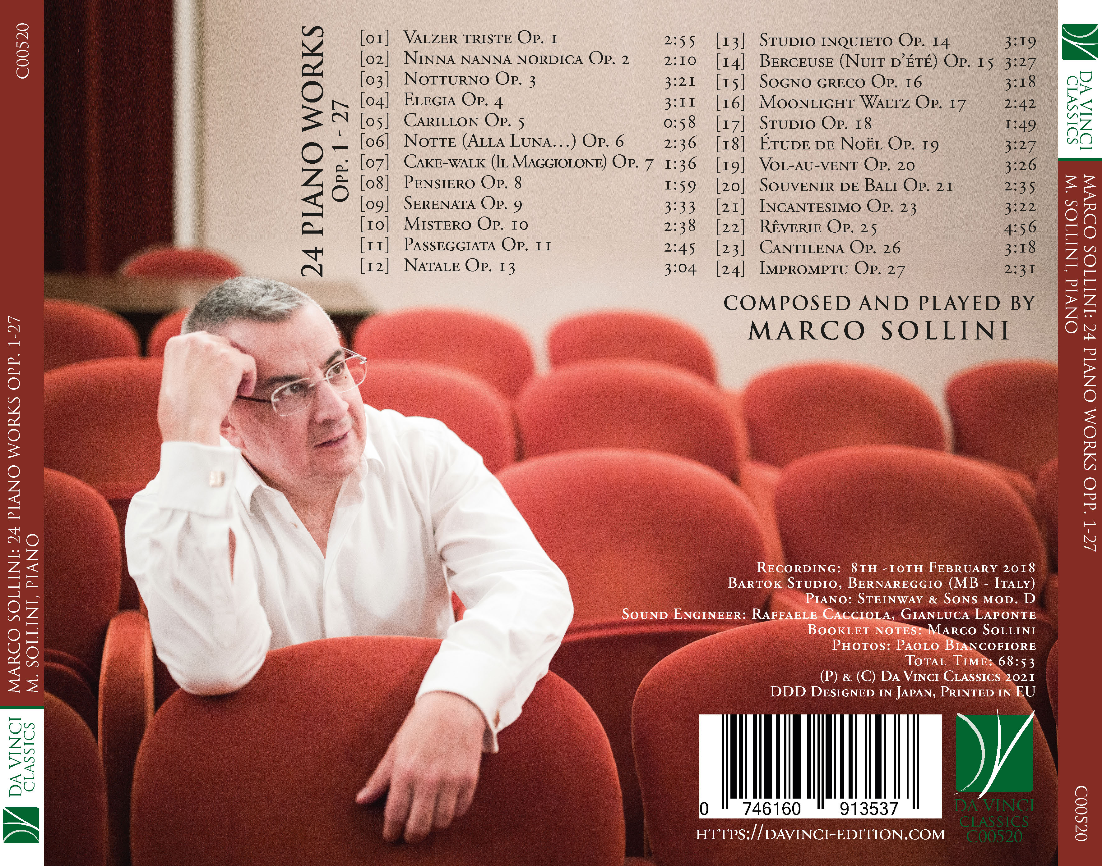 Marco Sollini: Italian pianist with a solid musical education was definited by Claudio Scimone “a great poet of the keyboard”. He has performed in some of the most important concert halls all over the world, as Salle Cortot of Paris, Musikverein Golden Hall of Wien, Concertgebouw of Amsterdam, Smetana Hall of Prague, Main Hall of the Cairo Opera House, Mailowsky Palace and Caterina Palace of Saint Petersburg, Solti Hall of the Liszt Accademy in Budapest, Manoel Theatre of Malta, Grossesaal of Mozarteum in Salzburg and others. He performed as soloist in recital and in prestigious Orchestras, as Dohnanyi Symphonic Orchestra and MAV in Budapest, Hungarian State Symphony Orchestra, Stuttgard Symphony Orchestra, Slovak Radio Symphony Orchestra, Serbian Radio Television Symphony Orchestra, I Solisti Veneti, Sanremo Symphony Orchestra, Orchestra Metropolitana Città di Bari, I Solisti Aquilani, Malta Philharmonic Orchestra, Ciudad de Elche Symphony Orchestra, Bohuslav Martinů Philharmonic Orchestra, Saint Petersburg State Symphony Orchestra, Cairo Symphony Orchestra, Kroatisches Kammerorchester, Euro Sinfonietta Wien, Kharkiv Philharmonic Orchestra and many others. He has a large discography with around 40 CDs devoted to the music of Bach, Kozeluch, Clementi, Mozart, Schubert, Chopin, Liszt, Thalberg, Poulenc, Rachmaninov, Rimskij-Korsakov, Menotti, Sollini. His discography also inclused the first world of Piano Music of Leoncavallo, Puccini, Giordano, Mascagni, Bellini, Verdi, Persiani, Offenbach. His four CDs devoted to Rossini Piano Music have been definited the “reference edition” by the Rossini German Society (Deutsche Rossini Gesellschaft). He has worked as contributing editor with the Publishing house Boccaccini & Spada for the complete edition of Puccini’s, Mascagni’s, Giordano’s, Leoncavallo’s, Bellini’s piano music, and other previously unpublished chamber compositions of Rossini and Mascagni.