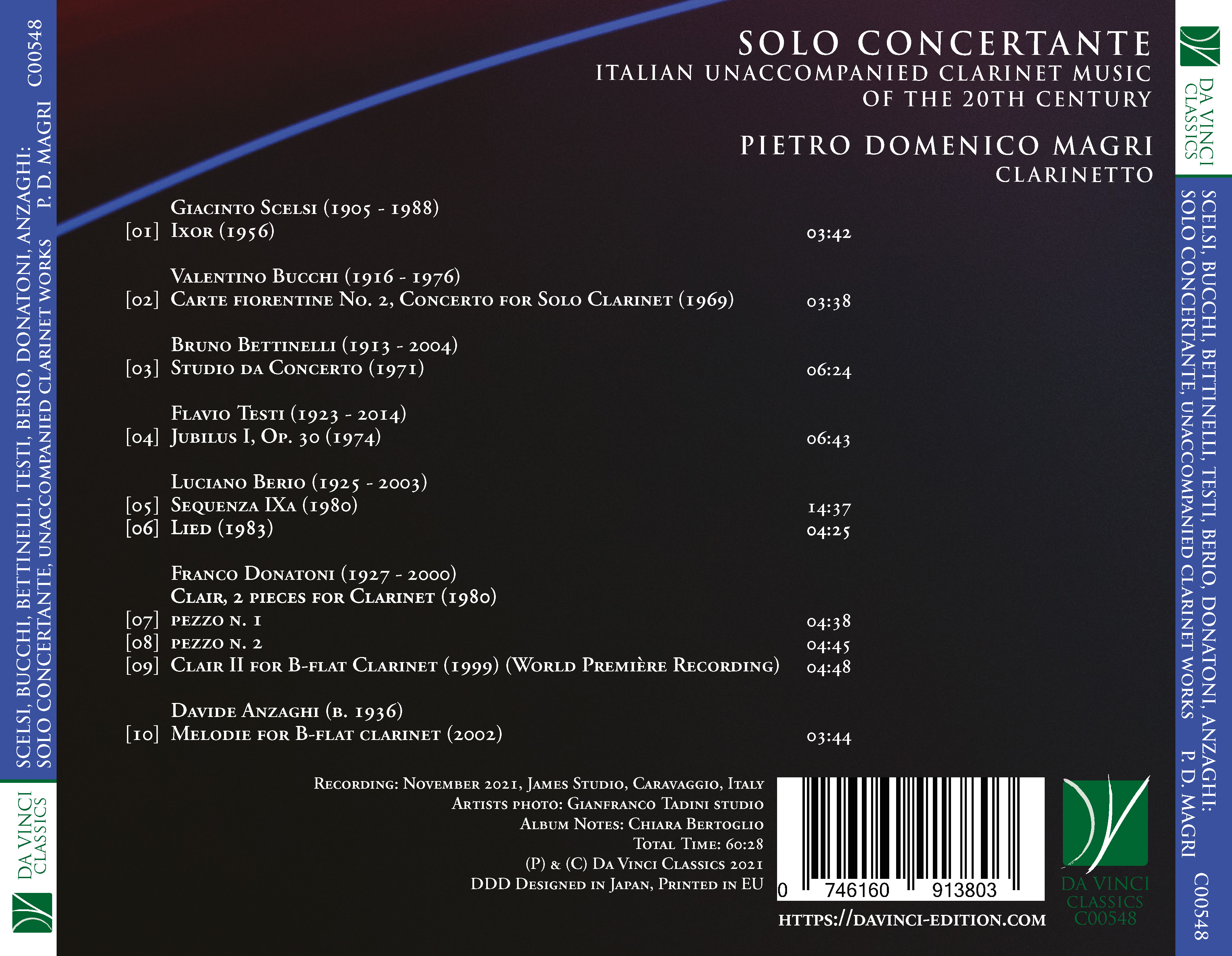 This Da Vinci Classics album is a magnificent display of what a single instrument can do, in the hands of composers who knew it well and of a performer who is familiar with its most hidden secrets. The seven composers represented here are all Italian. They were born within the space of thirty years, between 1905 (Scelsi) and 1936 (Anzaghi); they can be said, thus, to represent an entire generation. Whilst they are all among the most important names of Italian twentieth century music, their fates have been very different as concerns popularity and fame. Moreover, they show the various facets of musical research in their era, demonstrating an “Italian path”, in a manner of speaking, through the complex waters of contemporary music. What connects all of their works together, in fact, is the attention to how technique becomes sound; to how the quest for innovative means of sound production can transform itself in a “spiritual” experience. Many of these composers were deeply interested in and fascinated by spirituality, in its various and at times conflicting forms – in some case, this took the form of a nihilistic denial of reality and of all transcendence. However, they were by no means indifferent to the spiritual, in their adhesion to or negation of religion. Whilst they did explore most of the fundamental languages of the musical avantgardes, they also constituted (with their differences and in the absence of an explicit sharing of values) an “Italian” school, inspired by many sources, but unidentifiable with any.